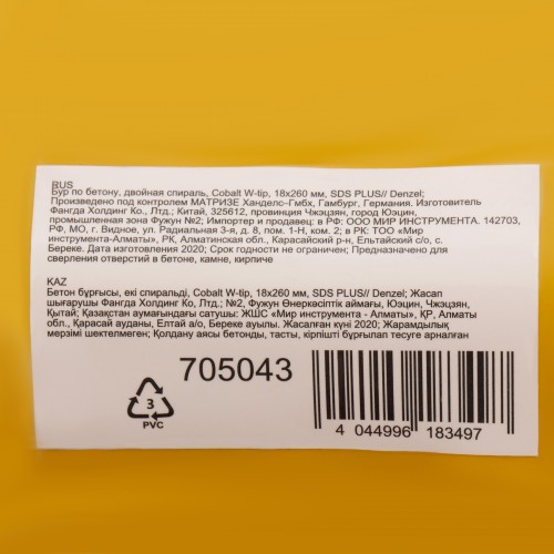Бур по бетону Denzel арт. 705043 с хвостовиком SDS PLUS и двойной спиралью предназначен для сверления отверстий в бетоне, кирпиче и камне. Он используется в качестве оснастки для перфораторов с патроном SDS Plus. Бур оптимален для проведения строительных, ремонтных, монтажных работ.