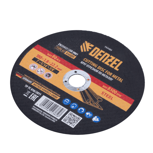 Круг отрезной по металлу Denzel 743483 (A46QBF) размером 180 х 1,8 х 22,2 мм оптимально подходит для реза углеродистых сталей. Используется на УШМ с посадочным диаметром 22,2 мм. Круг рассчитан на профессиональное и бытовое использование, сухой рез.