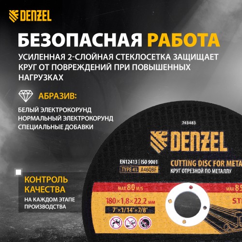 Круг отрезной по металлу DENZEL 180 х 1,8 х 22,2 мм, A46QBF