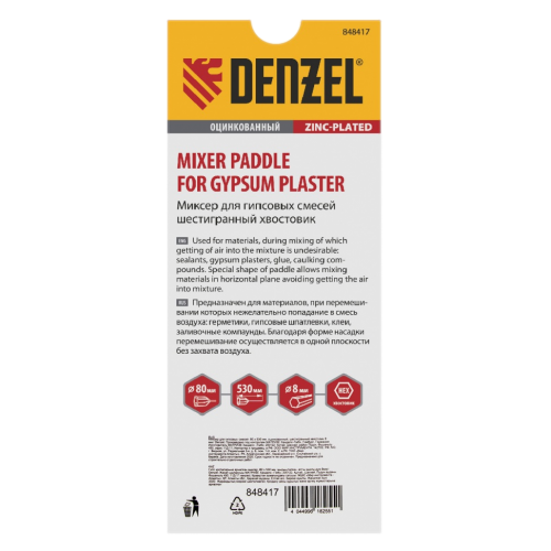 Миксер для гипсовых смесей DENZEL 848417, 80 x 530 мм, шестигранный хвостовик 8 мм