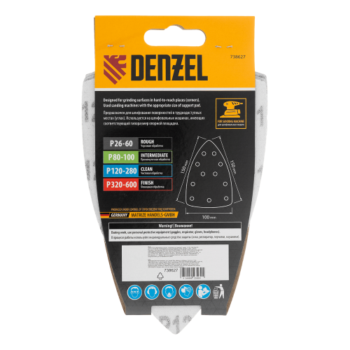 Абразивный перфорированный треугольник на ворсовой подложке «под липучку» Denzel 738627 размером 150 х 150 х 100 мм, 5 шт. в упаковке, имеет зернистость P 120 и предназначен для чистовой обработки металлических, деревянных и других деталей. Позволяет придать поверхности гладкость и подготовить ее к отделкеу, удобен для работы в углах и других труднодоступных местах. Треугольник совместим с плоскошлифовальной машиной Denzel 27614, также подходит для установки на другие шлифмашины с размером рабочей платформы 150 х 150 х 100 мм.