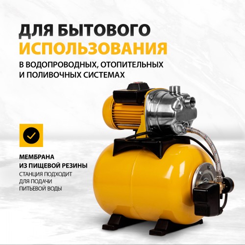 Насосная станция Denzel PS1000X 97211 мощностью 1000 Вт выполнена из нержавейки, оснащена ресивером на 24 л, обеспечивает производительность до 3500 л/ч и подъем воды до 44 м. Рассчитана на бытовое использование в загородных домах, квартирах и на дачах. Мощности 1 кВт вполне хватит для подключения устройства к оросительным системам, перекачивания воды в частный дом, обеспечения отопительных нужд и т.д. Станция не требует постоянного контроля со стороны пользователя, поскольку работает в автоматическом режиме. Благодаря ресиверу на 24 л в случае отключения электричества в доме всегда будет запас воды на нужды первой необходимости.