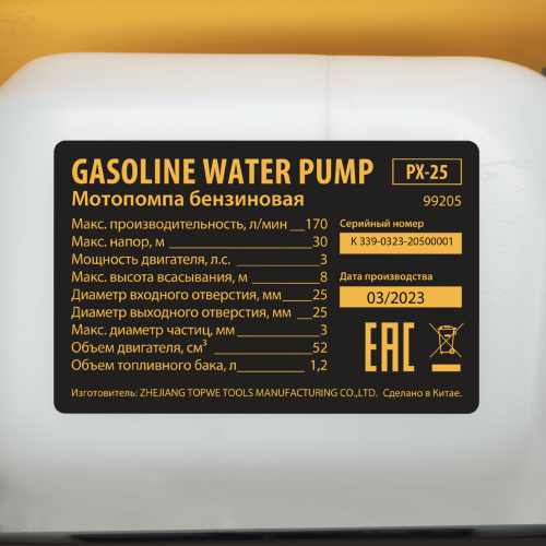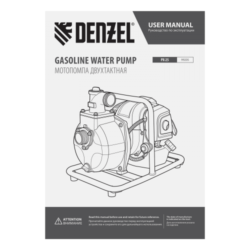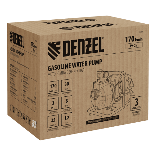 Мотопомпа бензиновая для чистой воды PX-25 DENZEL 52 см3, 1", 170 л/мин, глуб 8 м, напор 30 м