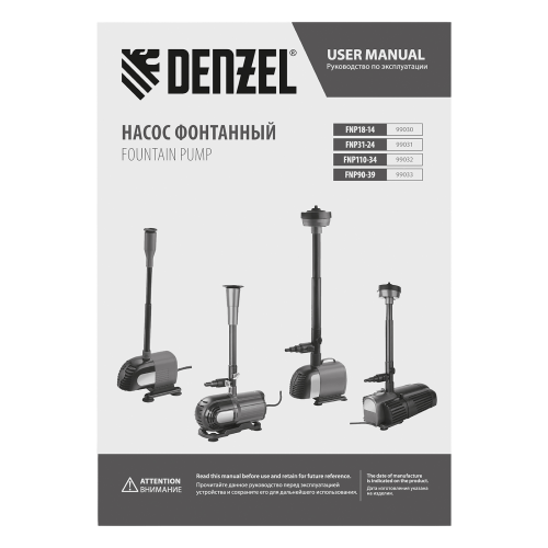 Насос фонтанный DENZEL FNP110-34, 112 Вт, подъем 3,4 м, 3400 л/ч, колокольчик/каскад/гейзер