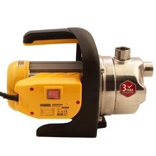 Садовый поверхностный насос Denzel GP1200X 97204 с корпусом насосной части из «нержавейки», мощностью 1200 Вт и производительностью 3700 л/ч, способен забирать чистую воду с глубины до 8 м из колодцев, емкостей и водоемов и подавать ее на высоту до 46 м. Обеспечивает стабильный напор и используется для организации системы полива и водоснабжения на даче. Производительности хватает для одновременного снабжения нескольких водоразборных точек.