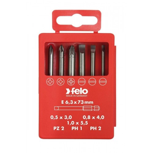 Felo Набор из 6 бит SL/PZ/PH Industrial 73 мм в кейсе размерами SL 0,5x3,0 / 0,8x4,0 / 5,5x1,0; PZ2 и PH1 / PH2. Набор предназначен для работ с различного рода крепежом.