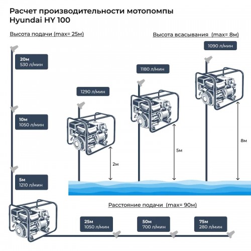 Бензиновая мотопомпа Hyundai может забирать воду с глубины до 8 м, что позволяет использовать ее для выкачивания жидкости из глубоких резервуаров и колодцев. Максимальная высота подъема составляет 25 м, а объем перекачиваемой воды достигает 1335 л/мин. Следует помнить, что производительность уменьшается при увеличении высоты и дальности подачи жидкости.