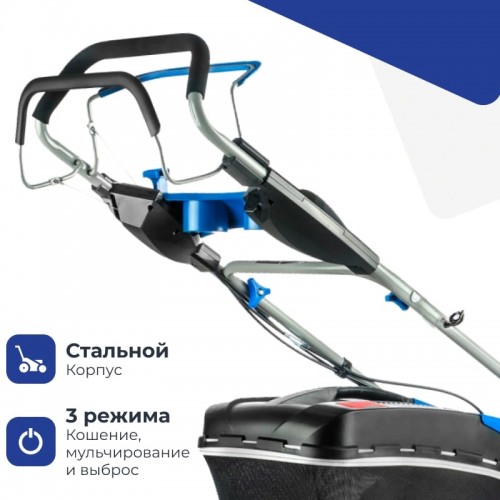 Газонокосилка Hyundai L 5110S поддерживает три режима работы. Срезанную растительность можно собирать в большой травосборник объемом 65 л или оставлять на газоне. Если установить мульчирующую заглушку, то мелко порезанная трава служит удобрением и способствует удержанию влаги в почве. Боковой дефлектор подойдет для кошения густой переросшей травы. Она будет выбрасываться в сторону, чтобы не путаться под ногами.