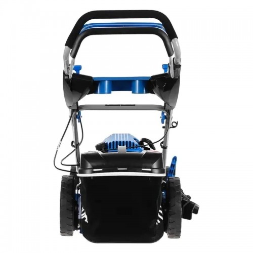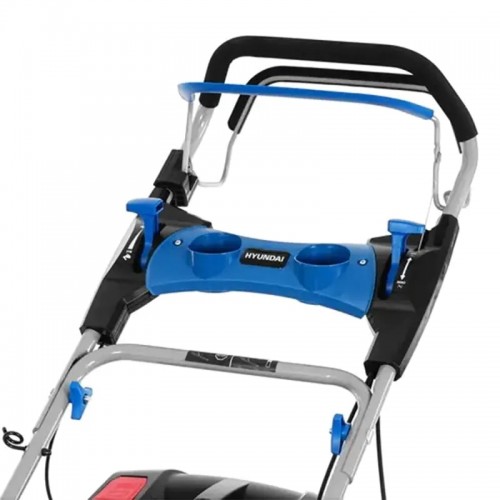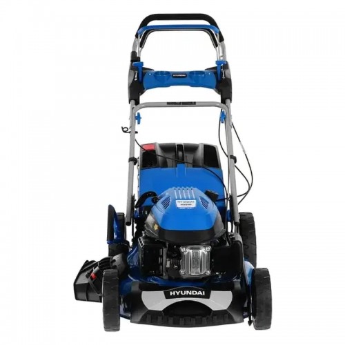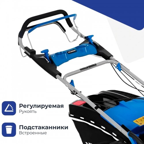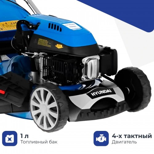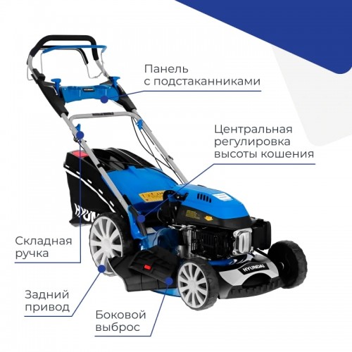 Управление работой двигателя и режущей системой выполняется при помощи двух прижимных рычагов. Если вы отпустите рукоятку, бензиновая газонокосилка Hyundai остановится, нож перестанет вращаться. Высота среза травы легко регулируется в диапазоне от 25 до 75 мм при помощи переключателя, который можно установить в одно из шести положений.