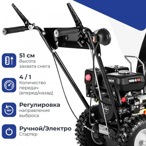 Зимний двигатель с ручным стартером без проблем заводится в мороз до -30°С. Праймер для предварительной подкачки топлива и система подогрева карбюратора облегчают запуск. Если поблизости есть электрическая розетка с напряжением 220 В, вы быстро заведете снегоуборщик Hyundai S 6561 нажатием кнопки электрозапуска.