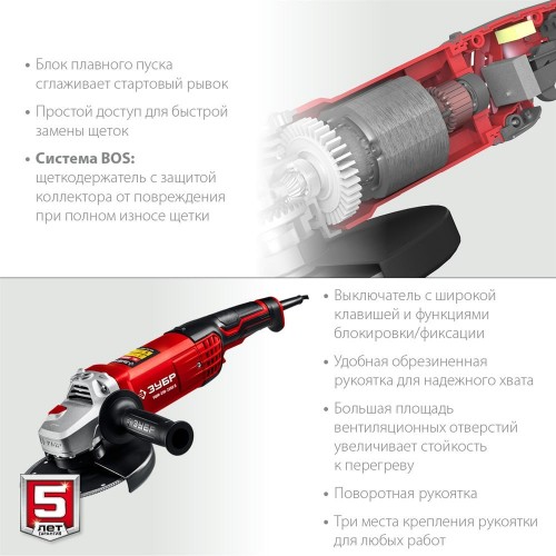 Угловая шлифмашина ЗУБР УШМ-230-2205 П, предназначена для шлифования и резки, а также для обработки сварных швов. Облегченная модель в линейке ЗУБР с сопоставимыми профессиональным моделям характеристиками для домашнего мастера. Система плавного пуска позволяет включать мощный двигатель без рывка и пусковой перегрузки. Удобная блокировка шпинделя для простой смены диска.