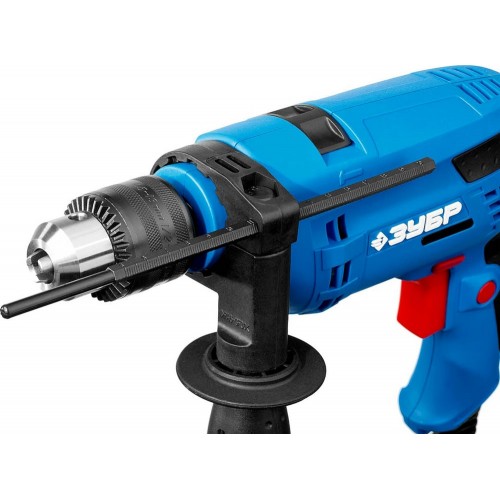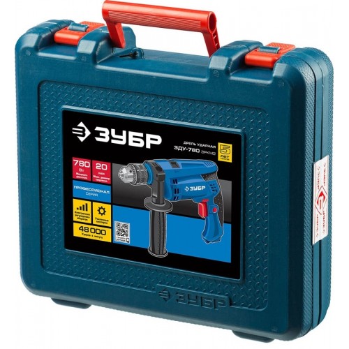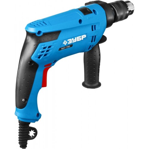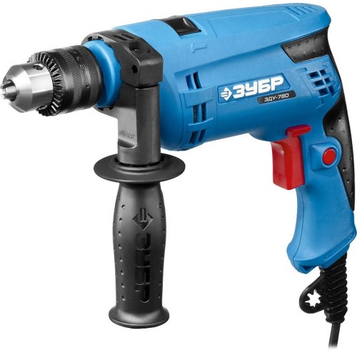 Дрель ударная электрическая ЗУБР ЗДУ-780 ЭРКМ2, предназначена для сверления отверстий в различных материалах (дерево, сталь и т. д.). Производительная дрель с качественным кулачковым патроном, плавной регулировкой оборотов и надежной конструкцией на подшипниках - лучший подарок мастеру. Функция сверления с ударом, широкий диапазон регулировки частоты вращения, удобная дополнительная рукоятка - все, что нужно для качественной работы. Надежный инструмент для эффективной, качественной работы. Производительная дрель для различных работ (сверление, заворачивание, перемешивание). Функция сверления с ударом позволяет выполнять отверстия в кирпиче и легком бетоне. Электронная регулировка оборотов в широком диапазоне расширяет возможности использования изделия. Изменение частоты вращения степенью нажатия на выключатель обеспечивает как плавное начало сверления во избежание увода сверла, так и быстрое сверление. Надежная конструкция на шариковых подшипниках для минимального биения шпинделя.