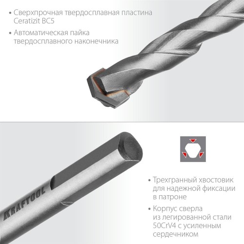 Сверло специальное по твёрдым материалам KRAFTOOL 29177-120-10, применяется для сверления быстрорежущих сталей, подшипниковой стали, чугуна, керамики, гранита, а также бетона и кирпича. Трехгранный хвостовик для надежной фиксации в патроне. Корпус сверла из высоколегированной стали.