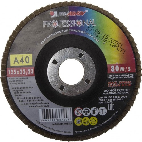 • ЛУГА 125х22.23 мм, P40, для УШМ, круг лепестковый торцевой абразивный для шлифования 3656-125-40