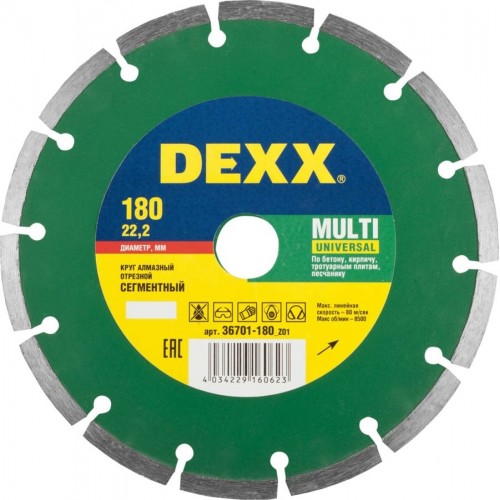 Алмазный диск отрезной DEXX 36701-180_z01, предназначен для резки бетона, гранита, строительного кирпича с помощью УШМ. Высококачественная сталь обеспечивает прочность и долговечность диска, алмазное напыление позволяет легко и максимально-точно производить работы.