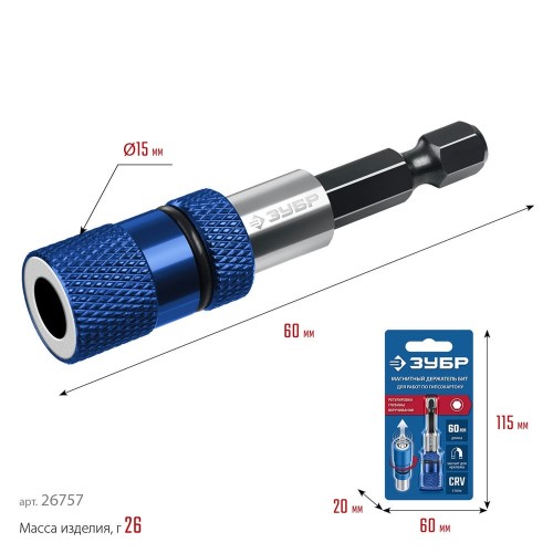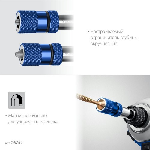 Адаптер для бит ЗУБР 26757, предназначен для монтажа и демонтажа резьбовых соединений совместно с механизированным инструментом. Ограничитель позволяет отрегулировать глубину вкручивания. Магнитное кольцо для удержания крепежа. Изготовлен из высококачественной Cr-V стали. Битодержатель с магнитом надежно удерживает биту.