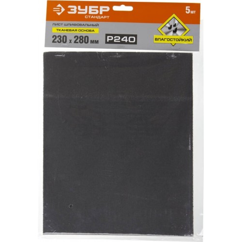 Лист шлифовальный водостойкий, универсальный на тканевой основе 230 х 280 мм, Р240, 5 шт. ЗУБР 35415-240, применяется при ручном шлифовании дерева, металла, автомобильной шпатлёвки, лакокрасочных покрытий и других материалов. Абразивное зерно имеет концентрацию чистого вещества поликристаллического оксида алюминия до 97%. Связующее вещество изготовлено на основе быстросохнущих спиртовых синтетических смол с полным отсутствием содержания серы и хлора. Абразивное зерно наносится электростатическим методом. Материал обладает антистатическим эффектом.