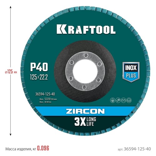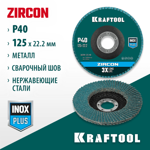 KRAFTOOL d=125x22.2 мм, P 40, круг лепестковый торцевой по металлу и нержавеющей стали ZIRCON Inox-Plus 36594-125-40