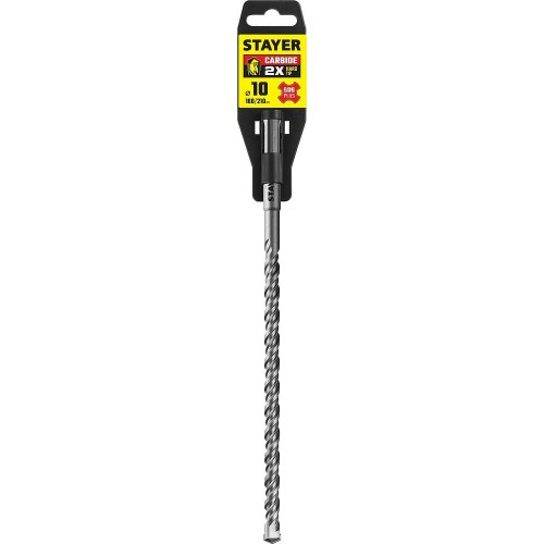 Бур SDS-plus STAYER 2930-210-10_z02, предназначен для сверления отверстий в бетоне, граните, кирпичной кладке, камне и твердом известняке. Повышенный ресурс. Твердосплавная пластина ВК8 в форме зубила и углом при вершине 130˚ облегчает центрирование бура. Спираль S4 с усиленным сердечником обеспечивает оптимальное соотношение между устойчивостью к излому бура и быстрым отводом шлама.