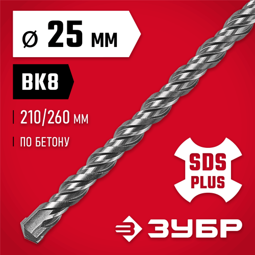 Бур SDS-plus ЗУБР 29315-260-25, предназначен для сверления отверстий в бетоне, граните, кирпичной кладке, камне и твердом известняке. Наконечник бура из твердого сплава ВК8 в форме зубила обеспечивает быстрое вхождение в материал и быстро отводит шлам в спираль. Спираль 4С с усиленным сердечником обеспечивает оптимальное соотношение между устойчивостью к излому бура и быстрым отводом шлама.