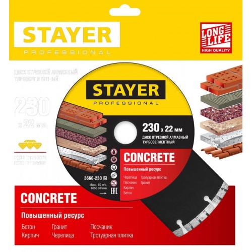 Неоспоримым преимуществом отрезных алмазных дисков STAYER серии PROFESSIONAL является их высокая производительность, увеличенный рабочий ресурс и универсальность применения при обработке различных строительных материалов. Быстрая эффективная резка высокопрочного бетона, кирпича, тротуарной плитки, бордюрного камня и других строительных материалов без принудительного охлаждения.