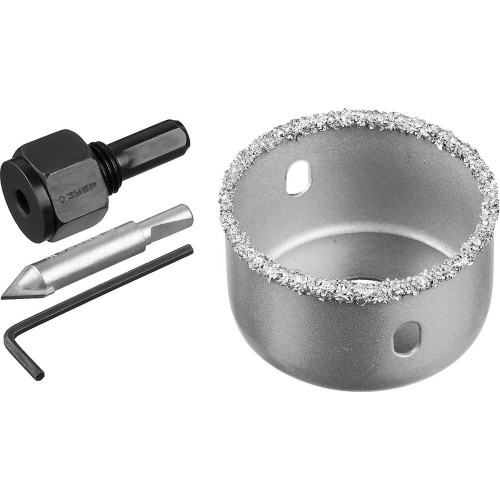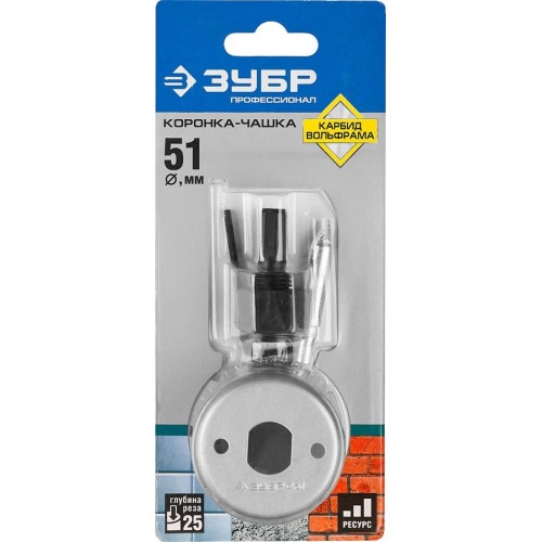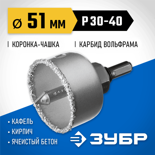 ЗУБР d 51 мм, L - 25 мм, карбид-вольфрамовая крошка, в сборе с державкой и сверлом, коронка-чашка 33360-051_z01