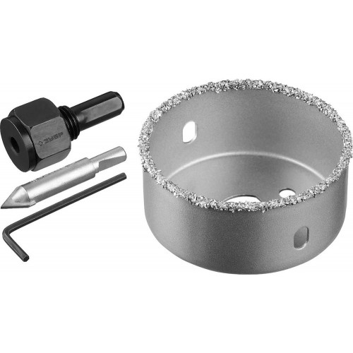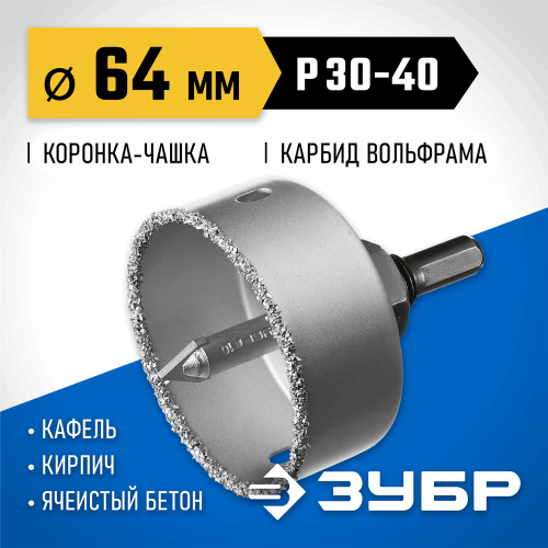 Буровая коронка-чашка с твердосплавным напылением ЗУБР 33360-064_z01, применяется при резке гипсокартона, кафельной и керамической плитки, кирпича, ячеистого бетона. Аккуратное сверление материала без трещин и сколов. Новейшая технология автоматического нанесения и спаивания твердосплавной крошки обеспечивает надежное соединение. Равномерное нанесение твердосплавных режущих элементов обеспечивает аккуратное сверление без трещин и сколов.