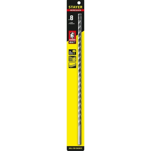 Сверло по бетону Stayer 2915-400-08_z01, предназначено для работ по бетону, граниту, природному и искусственному камню, кирпичной кладке. Тип спирали: П-образная фрезерованная. Хвостовик: цилиндрический.