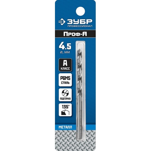 ЗУБР Ø 4.5 x 80 мм, сталь Р6М5, класс А1, сверло по металлу 29625-4.5 Профессионал