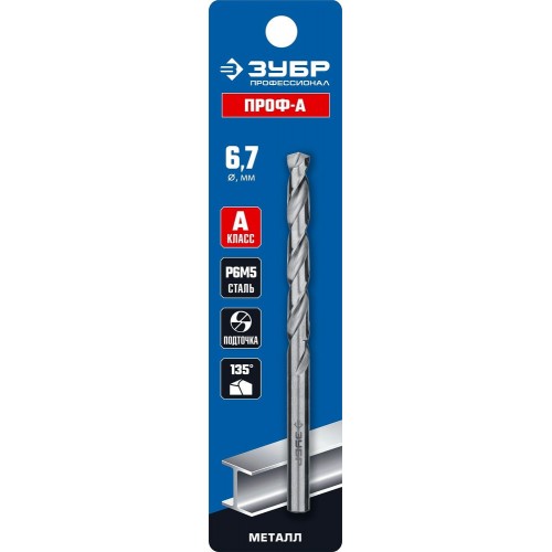 ЗУБР Ø 6.7 x 101 мм, сталь Р6М5, класс А1, сверло по металлу 29625-6.7 Профессионал