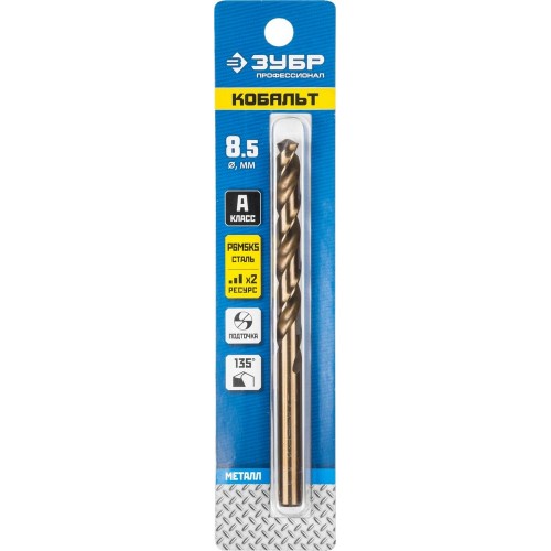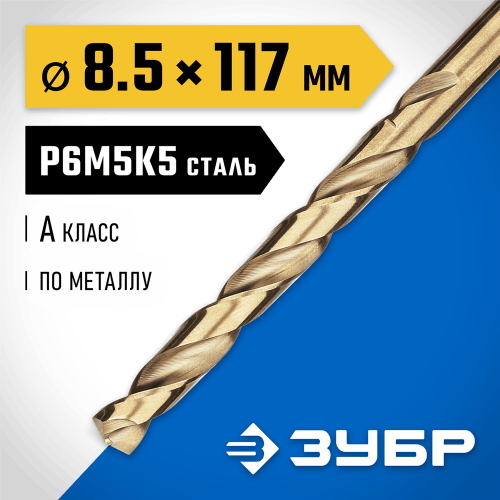 ЗУБР Ø 8.5 x 117 мм, сталь Р6М5К5, класс А, сверло по металлу КОБАЛЬТ 29626-8.5 Профессионал
