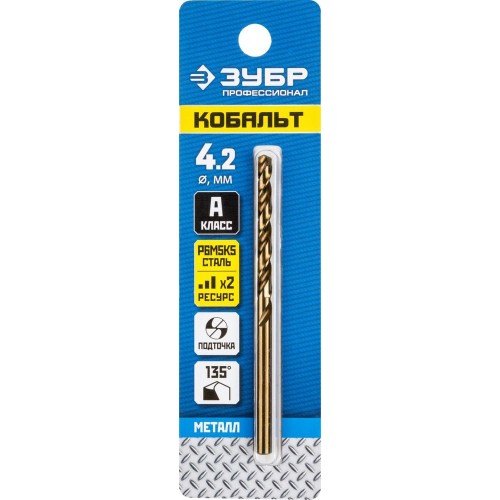 Сверло ЗУБР 29626-4.2, предназначено для обработки легированных и углеродистых сталей с пределом прочности до 1000 Н/мм², нержавеющих и жаростойких сталей, цветных металлов, серого чугуна и пластмассы. Высококачественное, точное и производительное сверло с максимальным сроком службы. Сверло изготовлено методом шлифования профиля по ГОСТ 10902-77 и соответствует классу точности сверления "А". Крестообразная подточка позволяет начать сверлить без предварительного кернения. Угол заточки при вершине равный 135° повышает производительность работ.