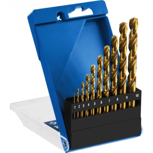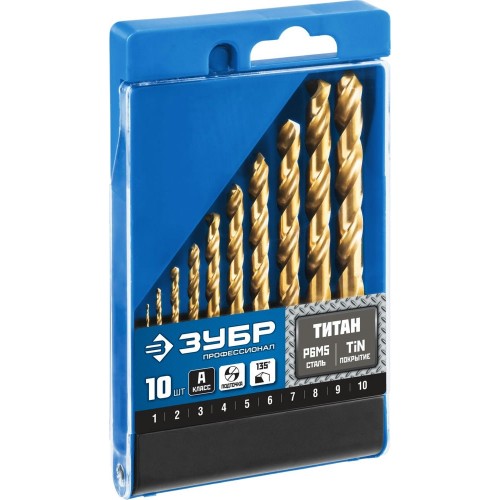 Набор сверл по металлу ЗУБР 29615-H10, предназначен для для обработки легированных и углеродистых сталей с пределом прочности до 900Н/мм^2, цветных металлов, серого чугуна и пластмассы. Изготовлено из стали Р6М5 и имеет высокую теплостойкость и продолжительный срок службы. Сверло изготовлено методом шлифования профиля по ГОСТ 10902-77 и соответствует классу точности сверления ″А1″. Крестообразная подточка позволяет начать сверлить без предварительного кернения. Угол заточки при вершине равный 135° повышает производительность работ.