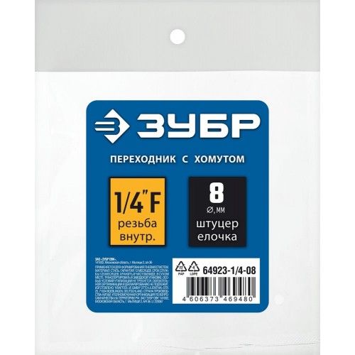 Переходник ЗУБР 64923-1/4-08 предназначен для формирования разнообразных пневмостистем. Высокая точность изготовления обеспечивает надежноть и герметичность. Надежное соедениение шланга с пневмосистемой. Обжимной хомут входит в комплект.