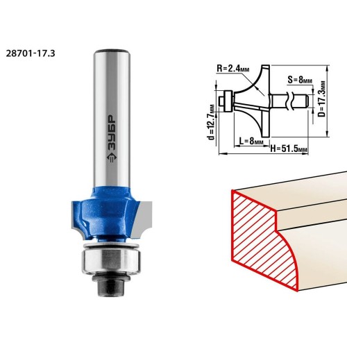 Фреза кромочная калевочная ЗУБР 28701-17.3, предназначена для скругления кромок при обработке столешниц, полок, шкафов и прочих работ с разнообразными видами древесины. Высококачественный твердый сплав для повышенного ресурса и чистоты обработки. Заточка производится только на самых современных станках с ЧПУ. Упорный подшипник позволяет обрабатывать криволинейные кромки без дополнительных приспособлений.