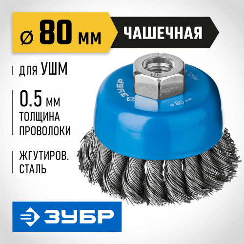 Щетка чашечная для УШМ ЗУБР 35275-080_z02, предназначена для зачистки поверхностей от лакокрасочных покрытий, ржавчины, окалины, различных стойких загрязнений, а также для зачистки сварных швов. Каждая щетка-крацовка ЗУБР проходит обязательный контроль качества. Все изготавливаемые щетки соответствуют действующим стандартам качества и обеспечивают безопасную работу в четко регламентированном диапазоне оборотов. Стальная жгутированная проволока. Повышенный ресурс щетки благодаря еще более высокой жесткости сплетенного пучка и увеличенной толщине проволоки.