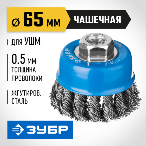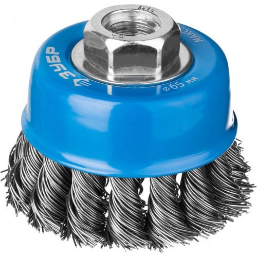 Щетка чашечная для УШМ ЗУБР 35275-065_z02, предназначена для зачистки поверхностей от лакокрасочных покрытий, ржавчины, окалины, различных стойких загрязнений, а также для зачистки сварных швов. Каждая щетка-крацовка ЗУБР проходит обязательный контроль качества. Все изготавливаемые щетки соответствуют действующим стандартам качества и обеспечивают безопасную работу в четко регламентированном диапазоне оборотов. Стальная жгутированная проволока. Повышенный ресурс щетки благодаря еще более высокой жесткости сплетенного пучка и увеличенной толщине проволоки.