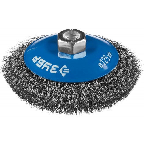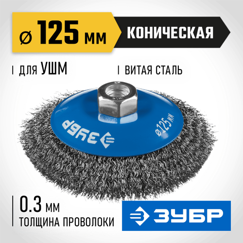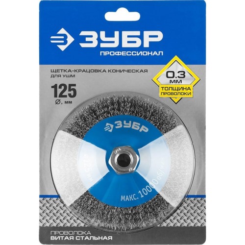 Щетка крацовка коническая для УШМ ЗУБР 35265-125_z02, предназначена для зачистки поверхностей в труднодоступных местах от лакокрасочных покрытий, ржавчины, окалины, различных загрязнений с применением значительных усилий, а также для зачистки сварных швов. Каждая щетка ЗУБР проходит обязательный контроль качества. Все изготавливаемые щетки соответствуют действующим стандартам качества и обеспечивают безопасную работу в четко регламентированном диапазоне оборотов.
