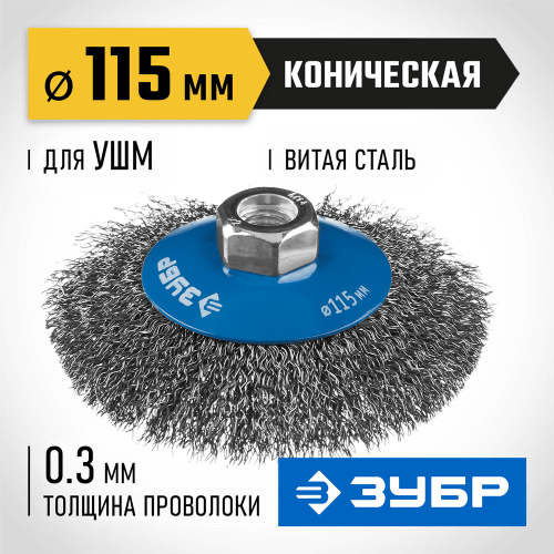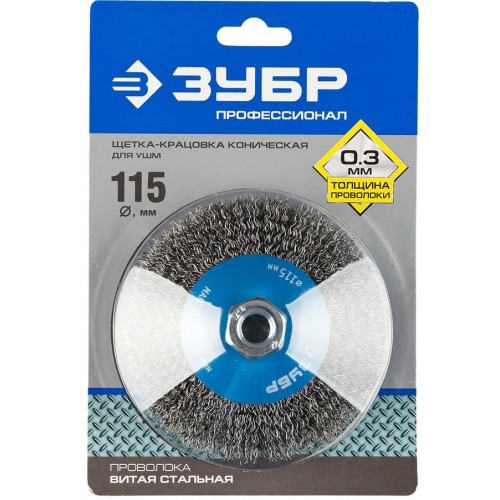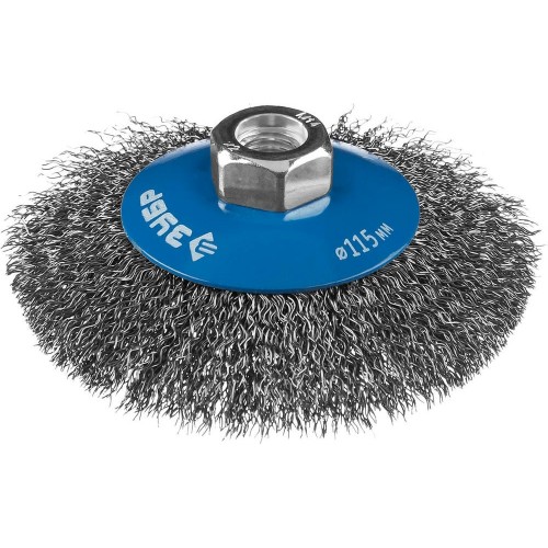 Щетка крацовка коническая для УШМ ЗУБР 35265-115_z02, предназначена для зачистки поверхностей в труднодоступных местах от лакокрасочных покрытий, ржавчины, окалины, различных загрязнений с применением значительных усилий, а также для зачистки сварных швов. Каждая щетка ЗУБР проходит обязательный контроль качества. Все изготавливаемые щетки соответствуют действующим стандартам качества и обеспечивают безопасную работу в четко регламентированном диапазоне оборотов.