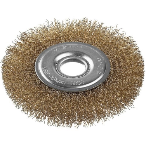 Щетка крацовка дисковая для УШМ ЗУБР 35187-125_z01, предназначена для зачистки поверхностей от лакокрасочных покрытий, ржавчины, окалины и различных загрязнений с поверхностей изделий из стали и цветных металлов. Щетка изготовлена из латунированной витой проволоки. Латунированное покрытие защищает рабочую часть щетки от коррозии. Витая форма проволоки позволяет обрабатывать поверхности без повреждений.