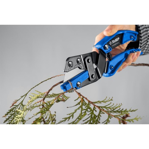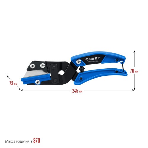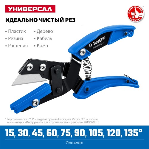 Ножницы ЗУБР 23371 предназначены для резки пластиковых профилей разнообразной формы. Универсальный (незаменимый) инструмент для чистого реза теперь со сменным лезвием. Идеально справляется с резкой различных профилей из резины и пластика, поможет бережно подрезать садовые цветы. Ножницы способны резать даже медный кабель сечением до 3х5,5 мм². Сменная площадка для резки под различными углами уже в комплекте. Чистый рез без замятия и заусенцев. Кромки не требуют дополнительной обработки. Стандартное сменное лезвие (трапеция тип А24) значительно продлевает срок службы инструмента. Удобная площадка для резки под различными углами (идет в комплекте) значительно расширяет возможности использования инструмента. Корпус из листовой 3мм стали выдеживает большие нагрузки. Эргономичная рукоятка сделанна из бензо-маслостойкого пластика. Подходит для работы в тяжелых условиях. Удобная система фиксации рукояток в закрытом положении повышает безопасность при хранении инструмента. Материал лезвия - У8А.