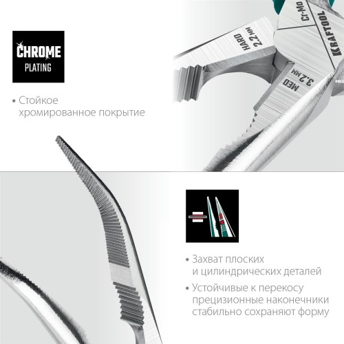 Тонкогубцы KRAFTOOL 22011-4-20_z01, предназначены для выполнения слесарных, монтажных и ремонтных работ. Эксцентриковое шарнирное соединение высокой износостойкости. Хромированное покрытие для защиты от коррозии. Изготовлены из высококачественной хромомолибденовой стали. Маслобензостойкие рукоятки для работы в агрессивных средах. Устойчивые к перекосу прецизионные наконечники стабильно сохраняют форму.