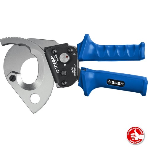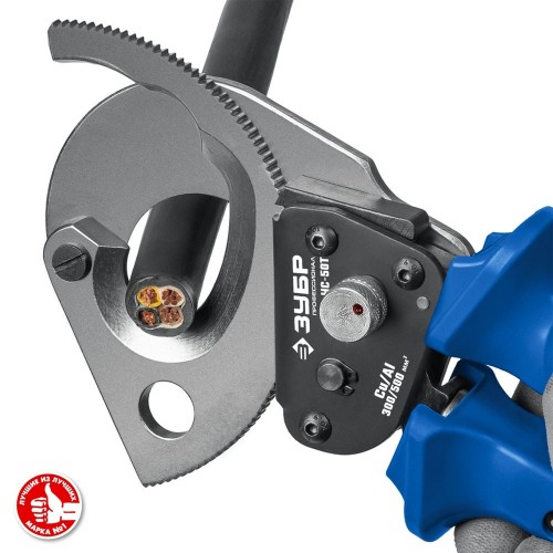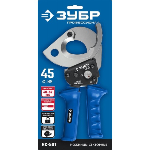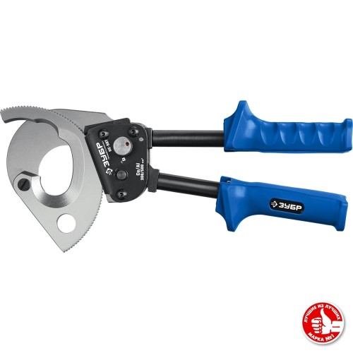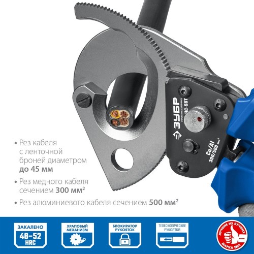 Секторные ножницы ЗУБР 23351-50, предназначены для перекусывания гибких проводников из цветных металлов установленного максимального диаметра. Особая закалка и заточка лезвий. Твердость лезвий HRC 48-52, надежный храповой механизм, телескопические рукоятки. Максимальная площадь сечения кабеля: медь - 300 кв.мм, алюминий - 500 кв.мм. Не предназначены для резки кабелей и проводов со стальным сердечником, стальной проволочной броней, стальных прутков и др. твердых материалов. Не работать под напряжением!