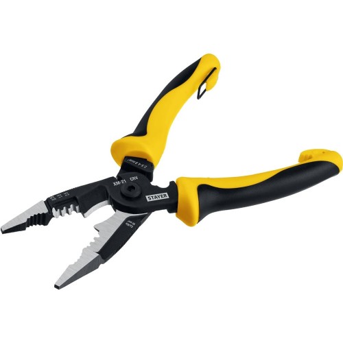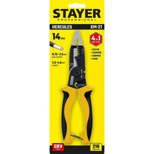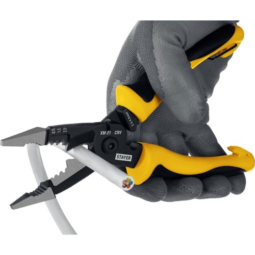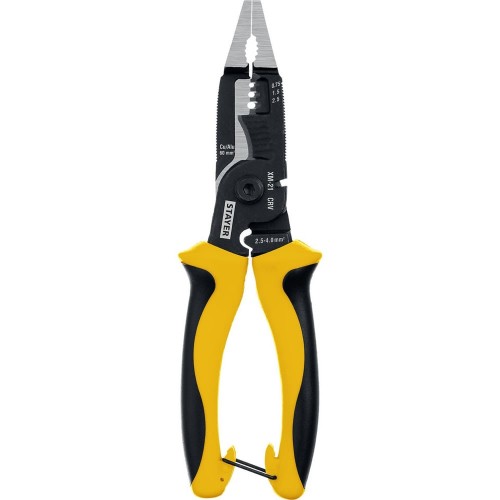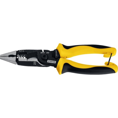 Клещи многофункциональные STAYER XM-21 23342-21, предназначены для резки проводов и кабелей, снятия изоляции, опрессовки, захвата плоского и круглого материала, гибки, удаления заусенцев при проведении электромонтажных работ. 4 инструмента в одном: кабелерез, съемник изоляции, кримпер и пассатижи. Трехпозиционные прецизионно заточенные режущие кромки для снятия изоляции. Универсальные гнезда для резки стальной проволоки и опрессовки контактных гильз. Винтовой шарнир обеспечивает плавность хода. Рабочая часть из Cr-V стали. Двухкомпонентные рукоятки из термопластрезины.
