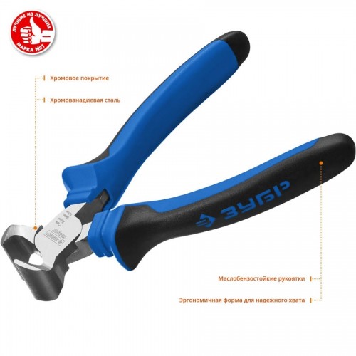 Кусачки торцевые ЗУБР 2201-7-18_z02, предназначены для выполнения слесарных, монтажных и ремонтных работ. Разработан для захвата и удержания плоских и круглых предметов, перекусывания проволоки средней твердости. Эксцентриковый шарнир увеличенной мощности, благодаря оптимальной передаче усилия, значительно облегчает работу. Специальная инструментальная сталь, легированная хромом и ванадием, для оптимального баланса твердости и прочности. Поверхность губок и режущие кромки дополнительно закалены токами высокой частоты для увеличения ресурса. Стойкое специальное хромоникелевое покрытие для защиты от механических повреждений и предотвращения коррозии. Эргономичные двухкомпонентные противоскользящие рукоятки создают максимальное удобство при работе.