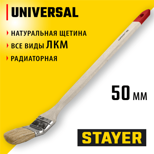 STAYER UNIVERSAL, 50 мм, 2", светлая натуральная щетина, деревянная ручка, все виды ЛКМ, радиаторная кисть (0111-50)