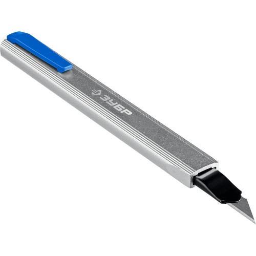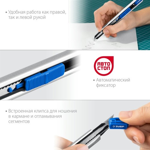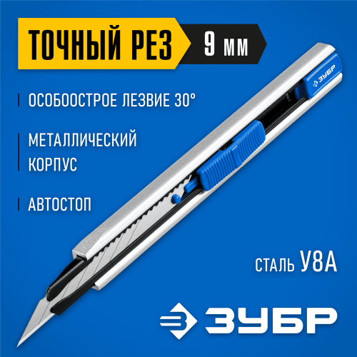 Металлический нож с автостопом ЗУБР 09152, применяется для эффективного разрезания различных материалов: линолеума, ковровых покрытий, гипсолитовых плит, гипсокартона, кровельных материалов, пластика, дерева. Компактный нержавеющий металлический корпус обеспечивает легкий и точный рез. Удобная работа как правой, так и левой рукой. Более острый угол заточки лезвия 30° для точных работ. Автоматический фиксатор. Встроенная клипса для ношения в кармане и отламывания сегментов.