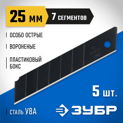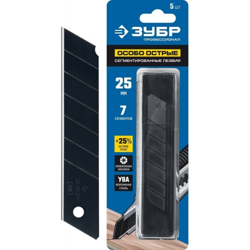 Лезвия ЗУБР 09715-25-5, используются в качестве сменных рабочих элементов в ножах с шириной направляющей пластины 25мм для разрезания различных материалов: линолеума, ковровых покрытий, гипсолитовых плит, гипсокартона, кровельных материалов, пластика, дерева и т. д. Обладают повышенным ресурсом, обеспечивают длительную и качественную работу.