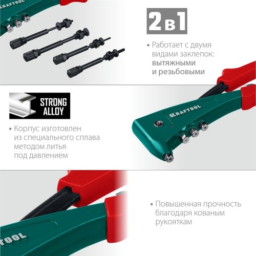 Комбинированный заклепочник KRAFTOOL выдерживает высокие рабочие нагрузки и предназначен для установки резьбовых и вытяжных заклепок из алюминия, стали и нержавеющей стали.