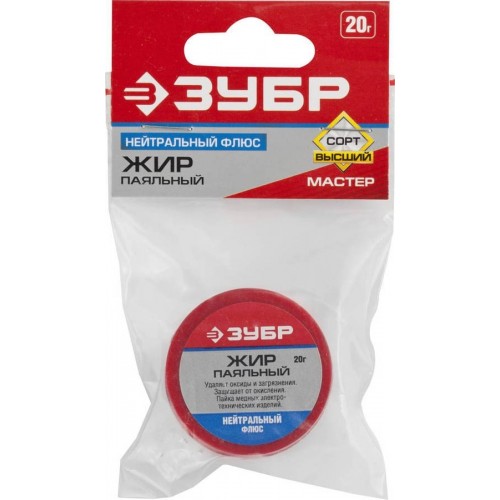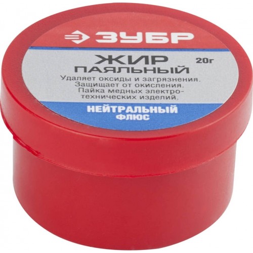 Жир нейтральный Зубр 55477-020 применяется для пайки радио- и электротехнических устройств. Хорошо держится на металлических контактах, обеспечивая точное дозирование и высокую скорость нанесения на большое количество мест паек. Не требует удаления остатков после пайки.
